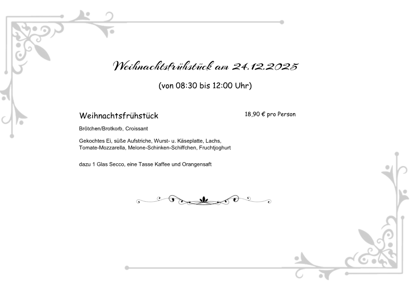 Am 24.12.2025 Weihnachtsfrühstück von 08:30 bis 12:00 Uhr, geöffnet von 08:00 bis 13:00 Uhr.
